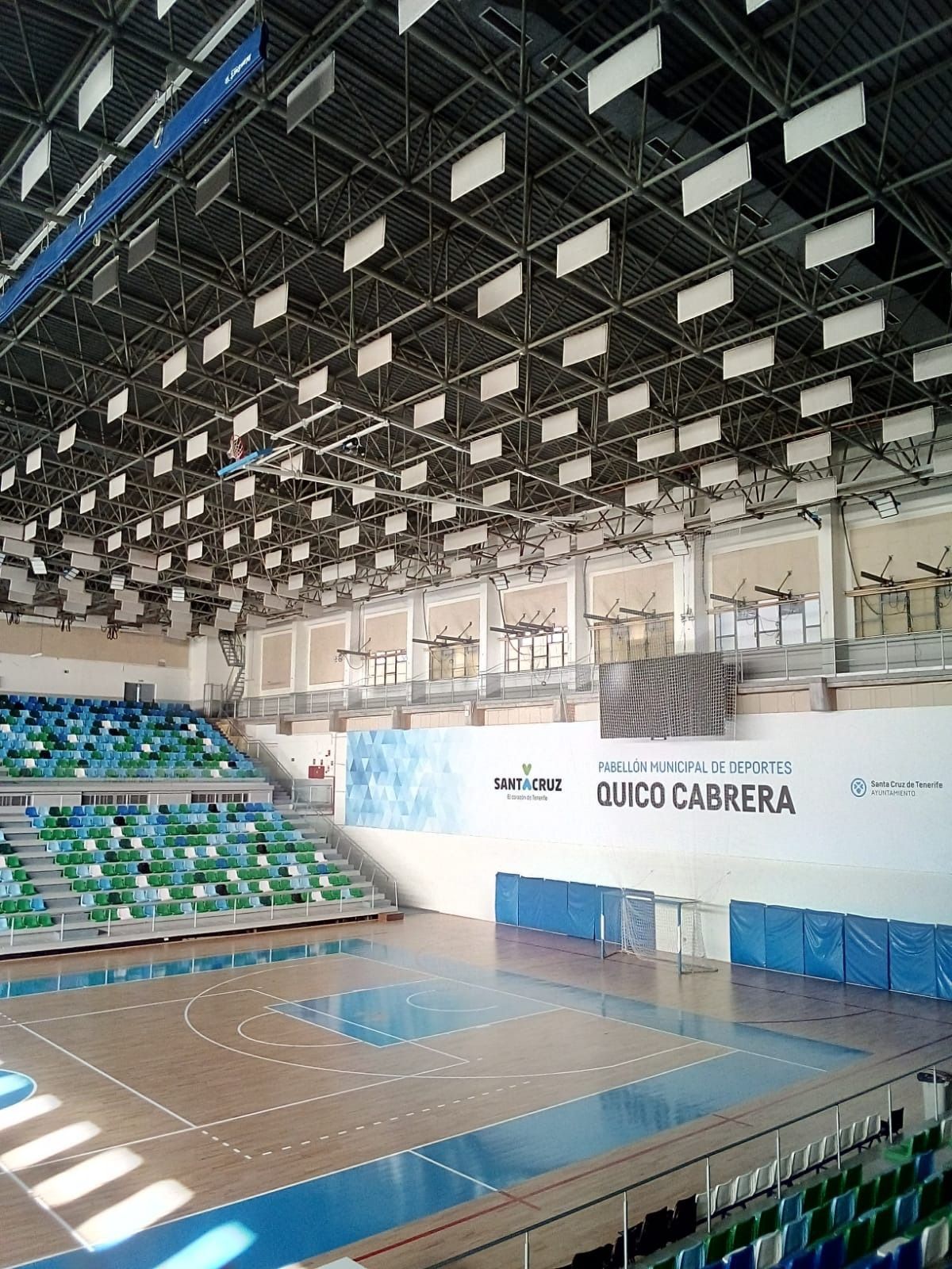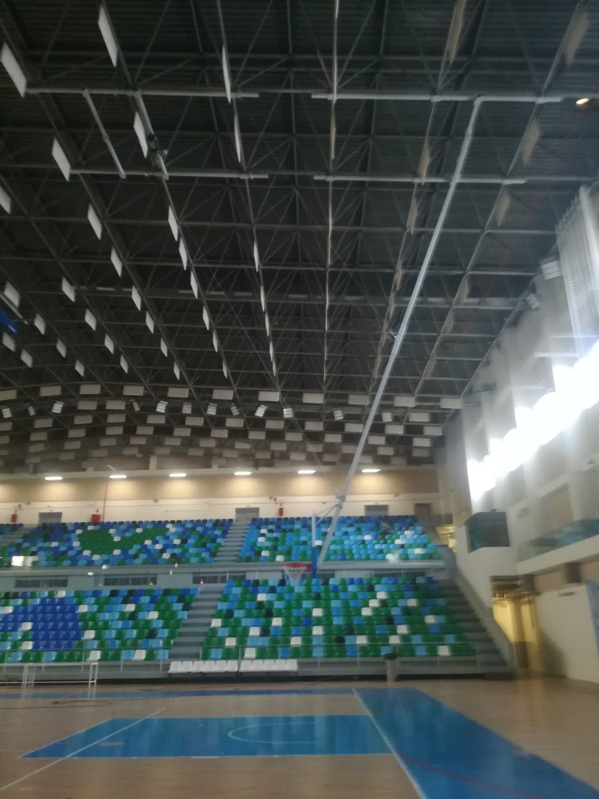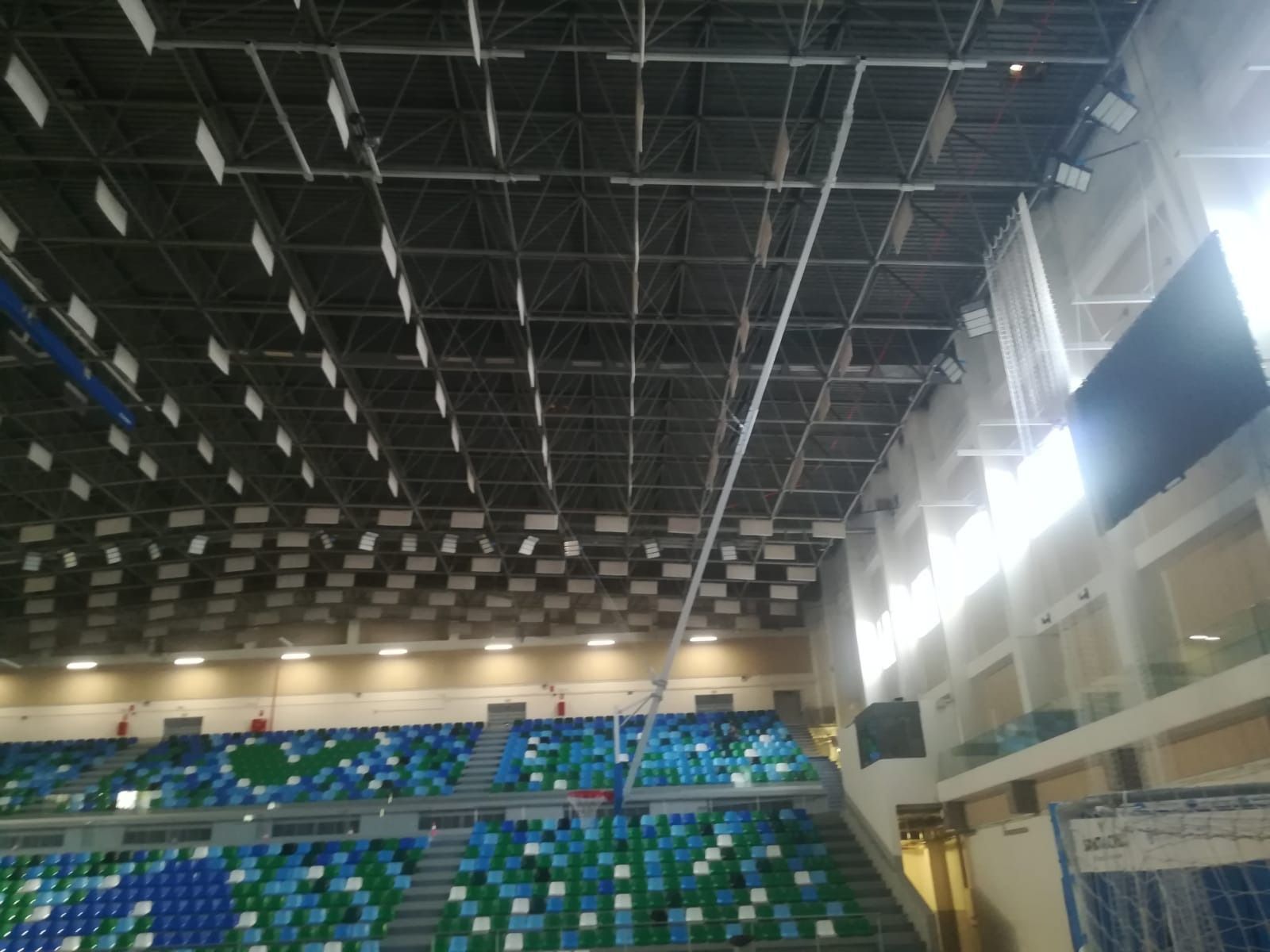 Estas son una de esas veces en la que realmente uno se siente orgulloso de pertenecer al equipo de Decan Sports. Nadie más en el mercado ha sabido resolver el difícil reto de ingeniería, ...y aquí está el resultado. 14m de canasta monotubo colgadas directamente en la parte superior y que permite una vez plegadas poder disponer de toda la altura del pabellón.